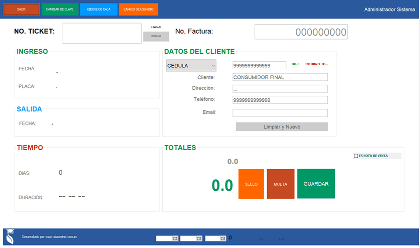 El sistema de parqueaderos, es una herramienta que nos permite, controlar el ingreso y salida de vehículos en un parqueadero, es un sistema completo que presenta desde la emisión de tickets, hasta reportes con los resultados de cobros diarios mensuales, semanalas, anuales.